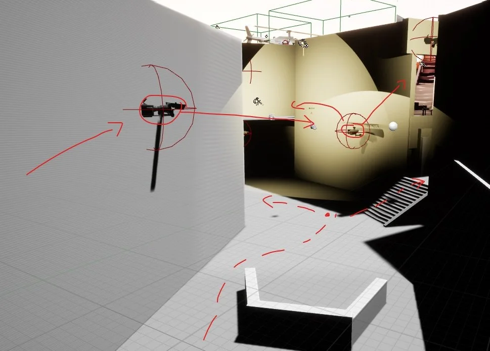 One of the biggest things I learned from the first go around was that we needed more choice in the levels themselves. Since what we had for our first mission was limited to being linear, I designed this space to have two main paths for the player to explore. These paths would have different narrative moments, reward the player with unique information, and require slightly different play approaches. There would be some level of overlap to allow for cutscene overlap, however ‘replayability’ was certainly something I was designing. This leads into the next big thing I learned; the player, even though they were effectively a planner / eyes in the sky character, could only be reactive. We wound up with this due to our reliance on cutscenes to drive the action. This means that it was much harder, near impossible, for us to create interesting choices especially for our implicit interaction style. We needed to allow and encourage the player to scout the level more, open pathways / trigger mechanics for the npc to interact with. Then each level would be now a sort of Rube Goldberg machine setup/planned by the player, then players would react when the plan goes awry.